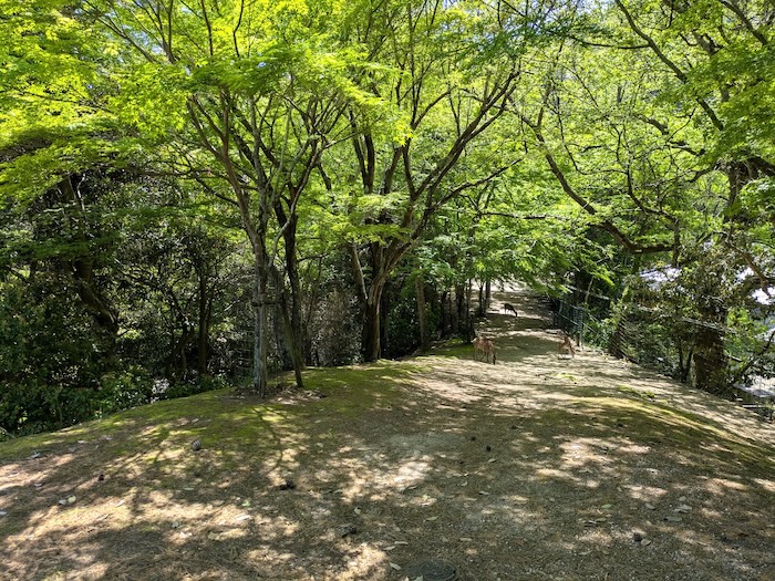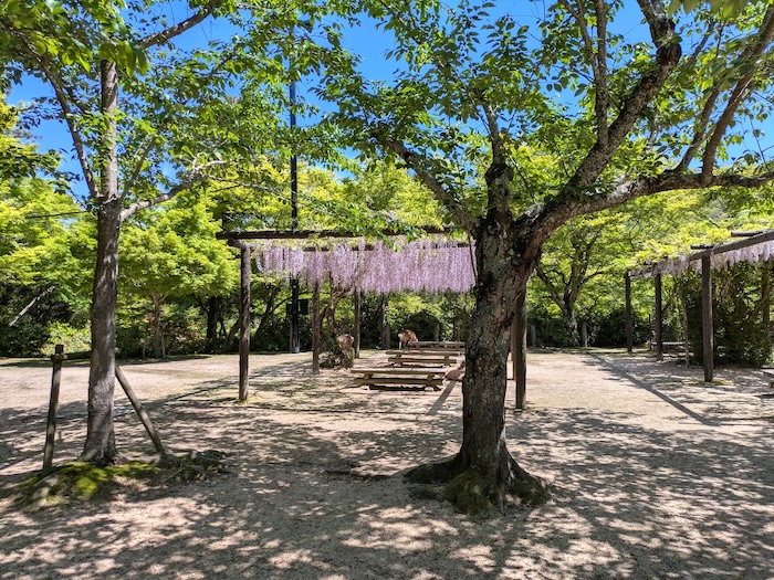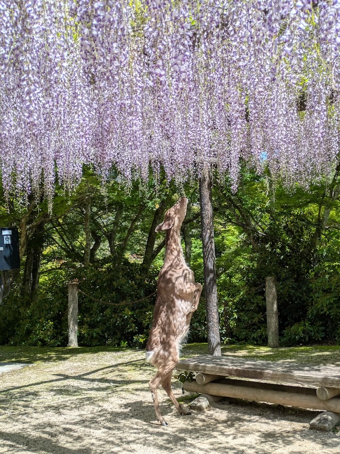 だって。そんな話を聞いて店を出たら、目の前で鹿が2足歩行しながら藤の蕾を美味しそうに平らげている現場に出会いました。