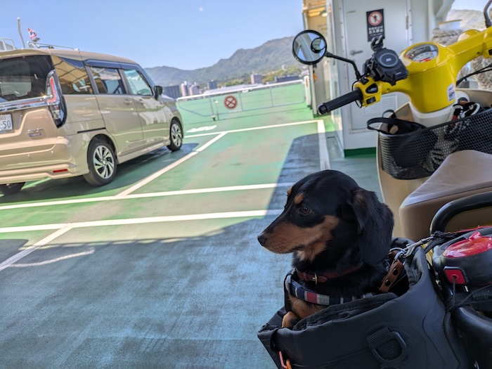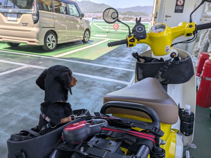 春の陽気に誘われて、またカブ×犬。今日は宮島へ渡ってみよう。