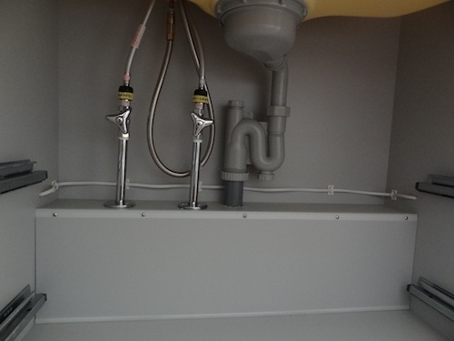 シンク下。ケーブルは引き出しとは全く干渉しません。