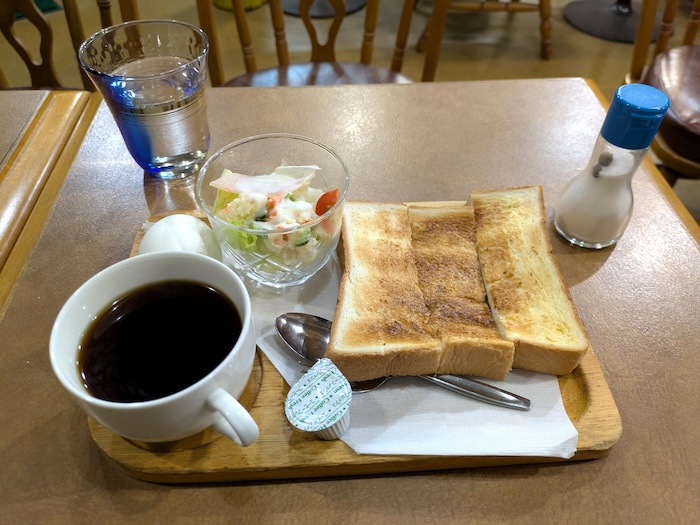 前日のモンブランらしいモンブランに加えて喫茶店のモーニングらしいモーニングを食べられるなんて素敵だな。ゆで卵に味塩振って食べるとか最高。