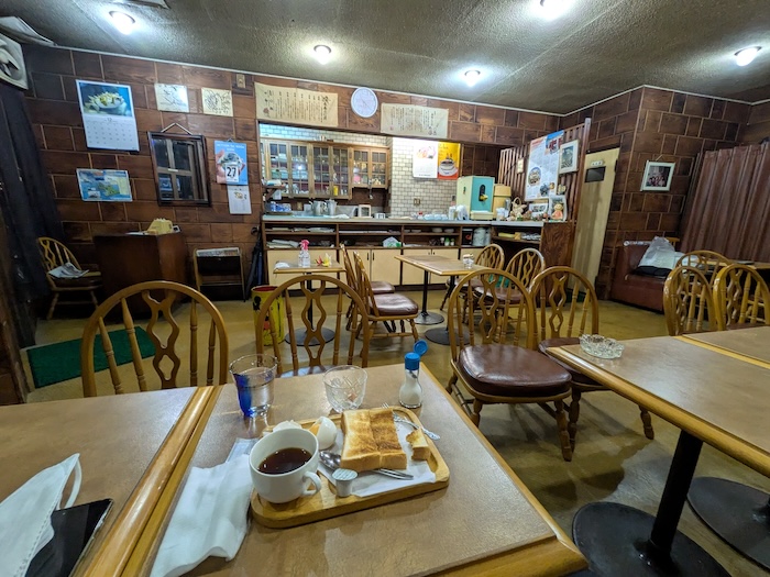 共有スペースに居るとオーナーさんが外からやってきてあれこれ片づけをされながら「ここから1分ほどのところに90歳を超えたおじいさんがやってる、モーニングだけの喫茶店があるんですよ。5時くらいからやってるからもう食べられるかも」と教えてくれました。それは行かなくては。