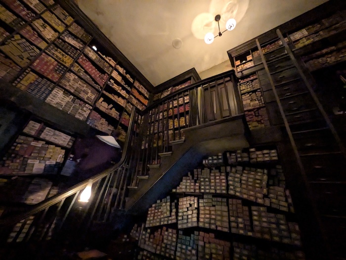 ホグズミード村の路地に、ひっそりと人の列がありました。なんだろうと並んでみると、オリバンダーの杖の店に通じる入り口から中に入れて杖が天井まで積まれた小部屋へ通されました。
