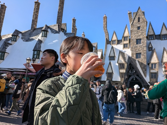 バタービールを求める人の列が少し短くなっていたので並んでみました。ムスメは飲み方が上品すぎて何度挑戦しても泡を口髭のようにすることができません。