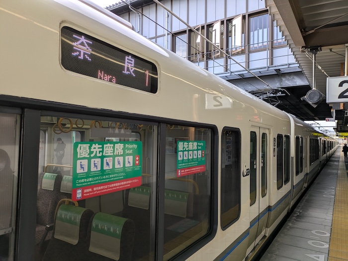 電車だって、奈良行き。車窓から眺める知らない街並み、馴染みのないスタイルの電車。座っているだけで到着する初めて訪れる街の駅。鉄道を使った旅行って面白いな。