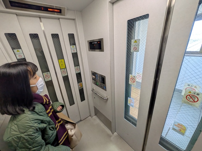 この日は全ての荷物を持っての移動なので、くたびれていることもあってエレベーターを積極的に使います。法隆寺駅のエレベーターは入り口と出口が90度ずれていていました。こんなの初めて。