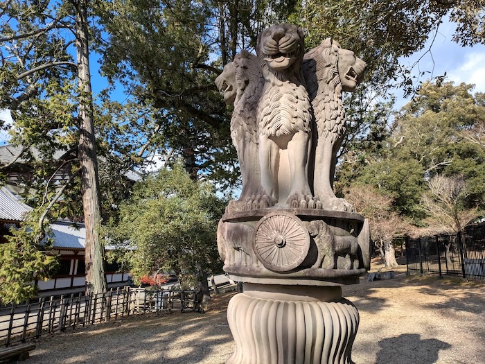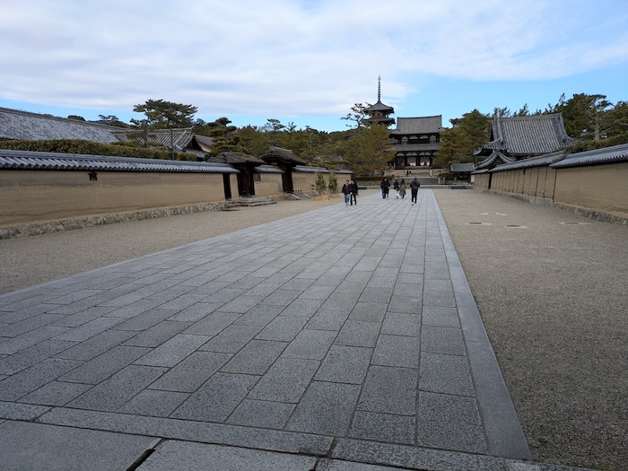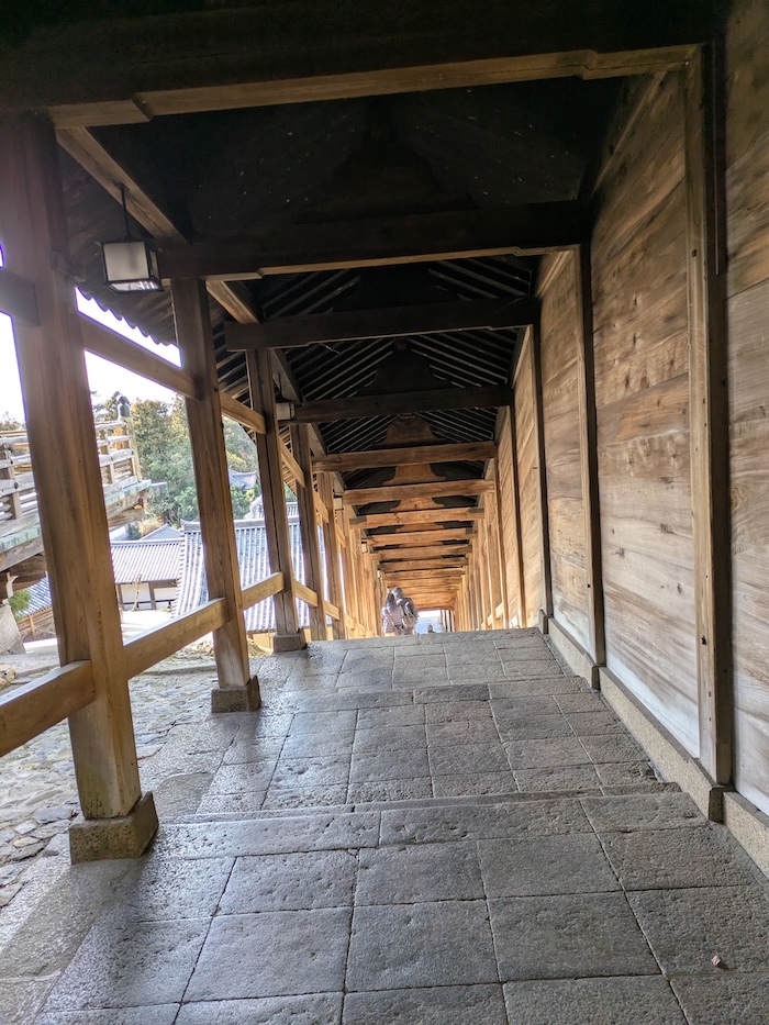 法隆寺の建物は、建物そのものだけでなく、日に焼け雨に洗われた回廊に並び立つ太い柱の色合いもとても美しく、それだけでも十分見応えがあります。いや、来てよかった。