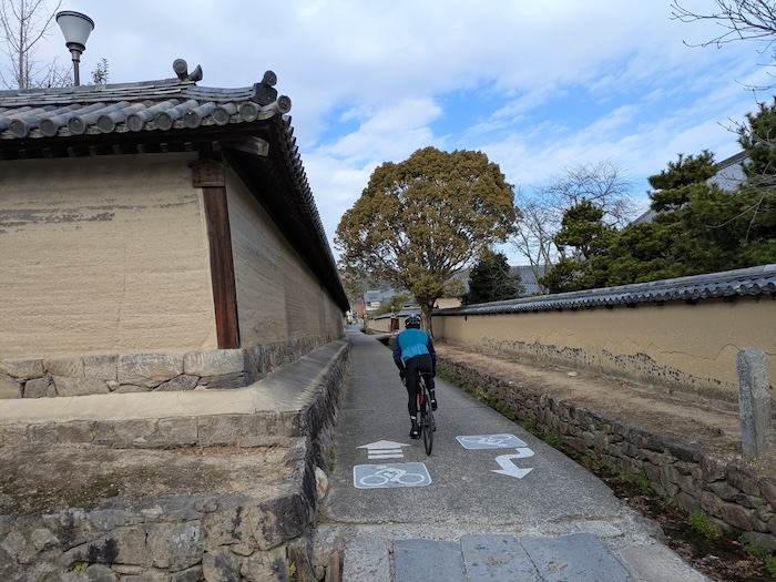 東大門を抜けて東の夢殿へ向かうところで、ロードバイクが目の前の路地を横切って駆け抜けていきました。え、境内に通った一般道を走れるの?なんかいいな。
