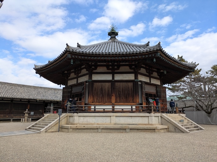 金堂そのものの見どころは壁画だけでなく五重塔に負けないくらい深い屋根の建物そのもの、そして何より鞍作止利作とされる釈迦三尊像や薬師如来、阿弥陀三尊、個人的には四隅にいる四天王像と、見どころ盛りだくさんでもう気絶しそうです。暗くてそれぞれが見づらいのが残念だなぁ。