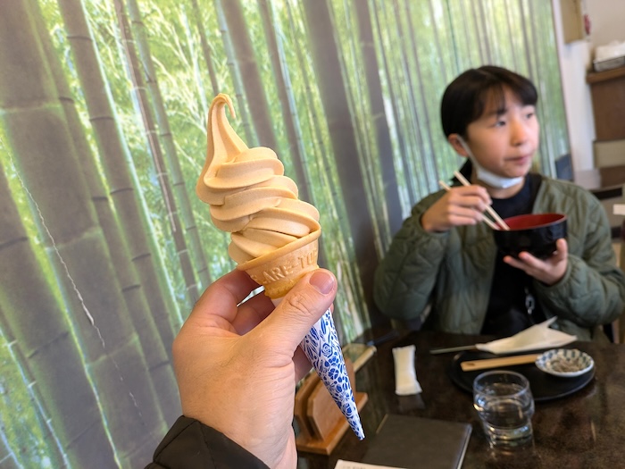 ムスメは「おしるこが食べたいね」と気の利いたことを言うし、狙ったかのように善哉を扱っている食堂があるし。僕は固形物を飲み込むのがしんどいので柿ソフトを食べましたが、これ食べてると喉が楽になってきて声っぽいものが出せるようになりました。喉の腫れにソフトクリームはとても助かります。