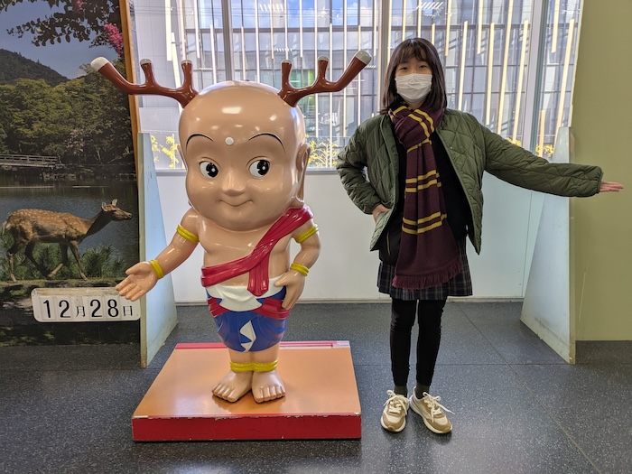 法隆寺から数駅進んで、奈良。奈良って、駅の反対側には普通に人が住んでるマンションが乱立しているし、駅前の雰囲気はこちらで言うところの岩国駅前みたいだし、全然派手さや豪華さはないのね。