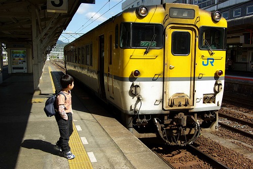 徳山から広島方面へは、山陽本線と岩徳線とがありますが、迷うことなく単線・ディーゼルのワンマン車両の岩徳線で。途中駅に無人駅があるためか、車内にバスのような運賃箱があるのも新鮮。沿線のローカルな風景が楽しみで大人は乗るわけですが、子どもは相当退屈していたので‥「見えるものしりとり」しながら帰りました。窓から見えるものでするしりとり。おかげで子どもも風景に釘付け。