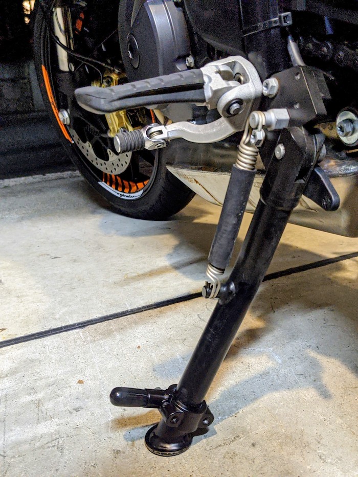 変に前方にオフセットされている390AdventureRのサイドスタンド。