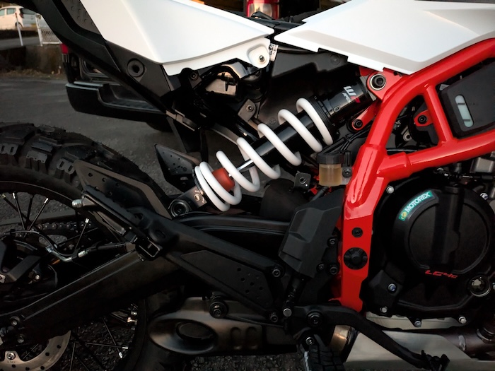 こんなサスの動かないバイク、乗れたもんじゃない。リアのプリロード全抜きだ(といっても戻せるのは2クリック)。