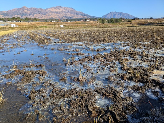 田んぼ、凍ってました。前夜の予報では氷点下3度の朝でした。
