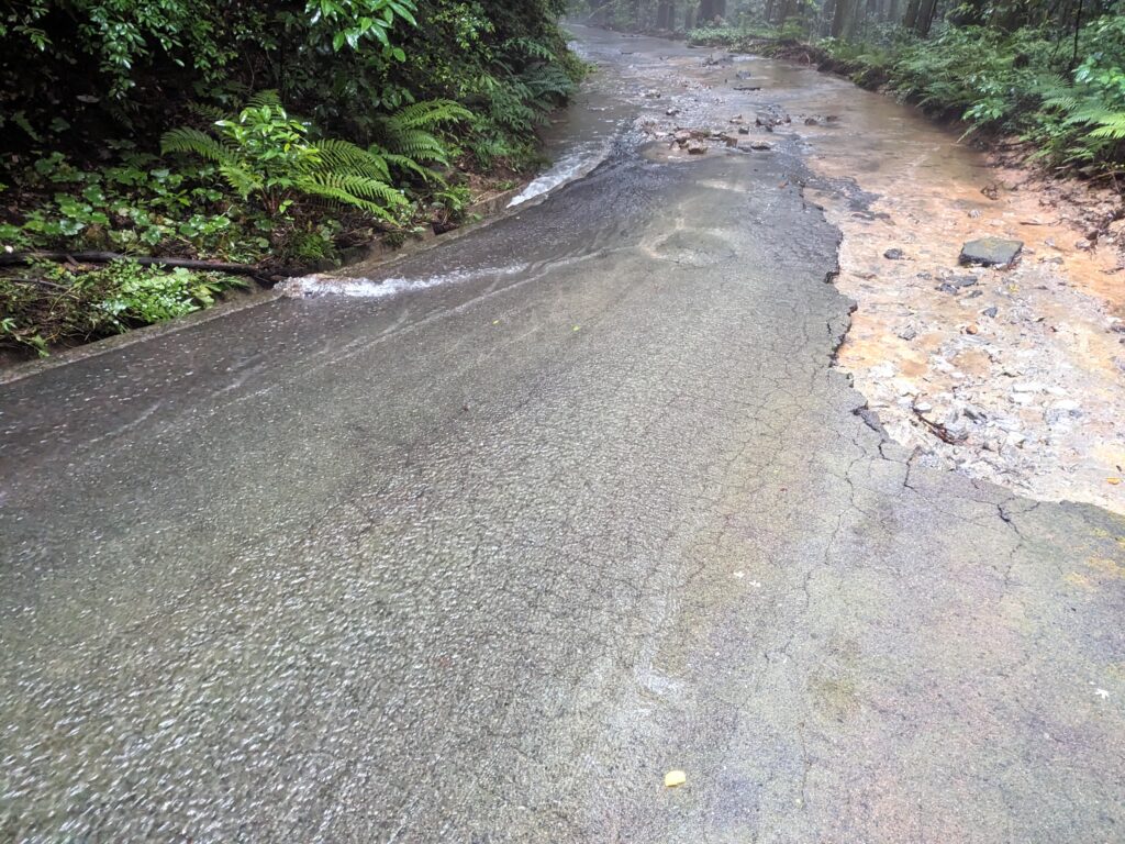 ここあたりから先へ進むにつれて路面を流れる水の量が徐々に増えて本当に川みたいになってきました。路面の両脇の土を水が流してしまって、路面もボコボコになっていきます。