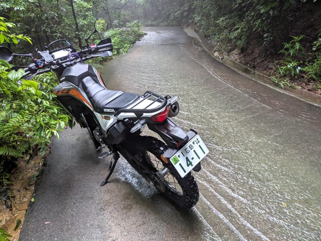 傾斜がきついところは水流が強くて路面のアスファルトが完全流されてに無くなっています。路面の下にあった細かい砂は水に流されて水の底にはゴロゴロした岩が転がっているのに気付かず、軽い気持ちで突っ込んでいって転んでミラーを割りました。転んで手をついたら結構な水深で、ちょっと恐怖を感じました。