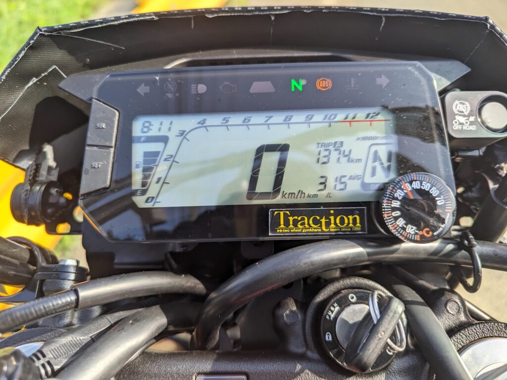 高速道路を小一時間走って燃費は32km/Lです。テクニクスのリアショックのおかげかフワフワ感もなく、高速走行中のフィーリングはオフ車というよりもオンロードバイクで普通に走っている感覚で、セローで高速を走るときに感じていた「上限ちょい手前まで回し続けてひたすら楽しくない」感じもなく、至って普通に車の流れにあわせて走れる上に、まだ30km/h分くらいは余裕がある感じ。同じエンジンのCB250Rにも乗っていましたが、さすがにCBほど速度的に高速巡行が楽に感じないのはギア比とポジションの関係でしょうね。