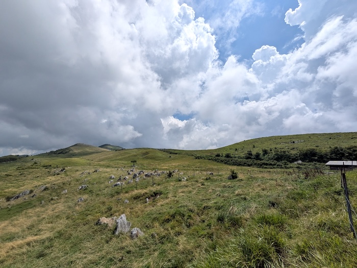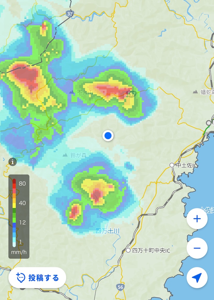 天狗高原から見る、四国らしい折重なる山並みの景色がとても好きで‥でも、なんか暗くなってきていない?と雨雲レーダーをみると、結構周囲には雨雲が育って囲まれていました。急いで下山。