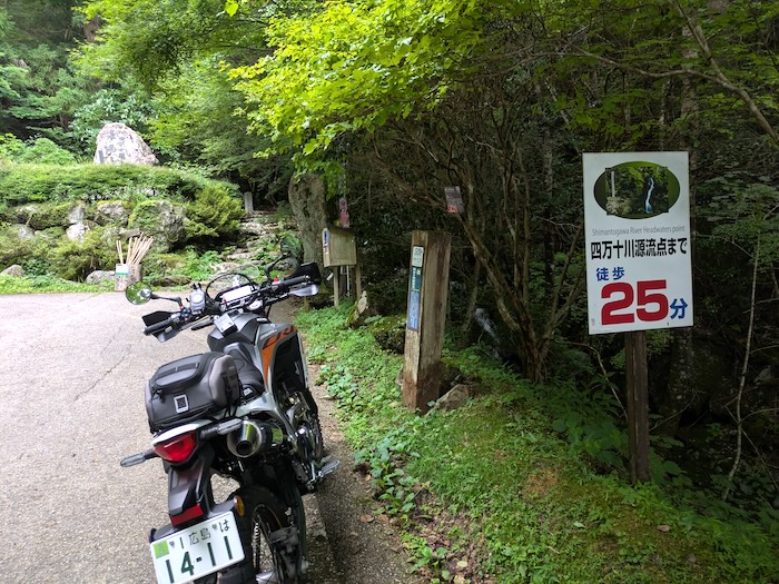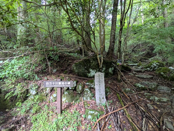 四万十川源流地点の案内に従って車で上がれる終端から源流点まで徒歩25分だそうですが、だいたいこういう表記って黙々と歩けば2/3くらいの時間で到着します。ここも実際そんなもんでした。