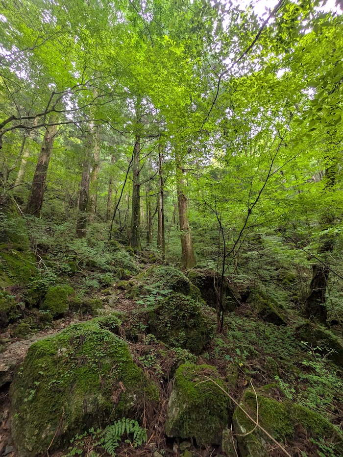 スタート地点には石の碑とかがあって人の気配を残しているけれど、ここから先は本当に原始の森に踏み込むって感じです。
