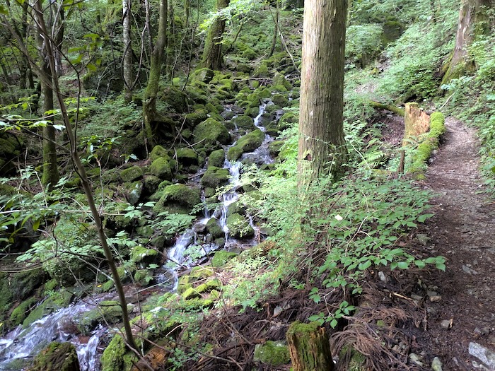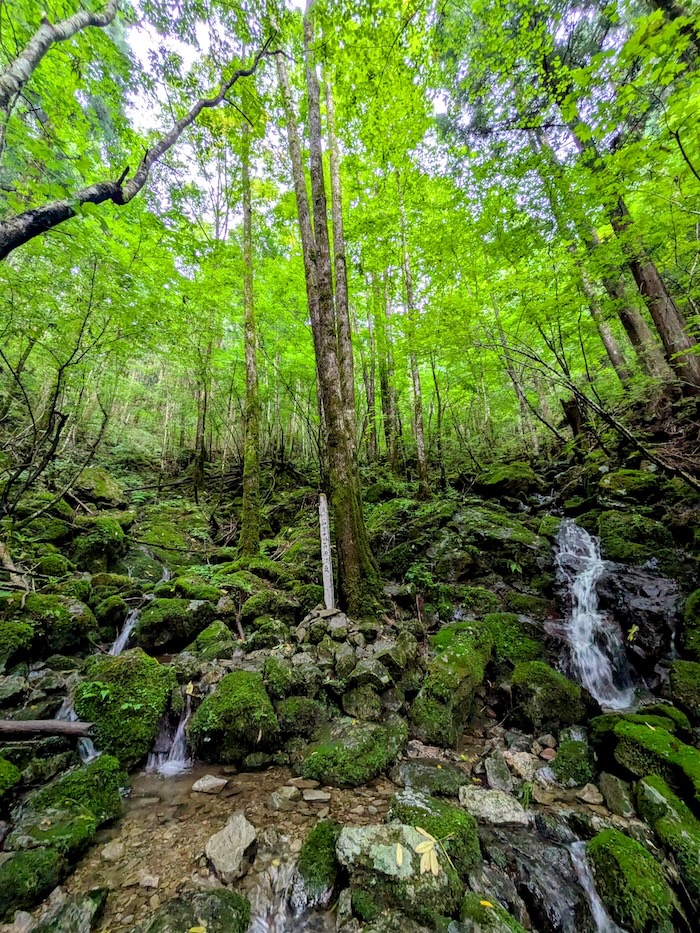 源流付近なのでもっと細々と水が流れているのかと思ったら、思いの外ザバザバと水が流れ落ちています。水の流れは1本ではなく、この沢に向かって方々から水が湧き出して集まっている様子。