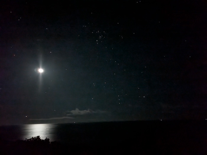 展望所まで行ってみると、月に並んで太平洋の水平線から横倒しのオリオン座が登ってくるところでした。心底たまげた。こんな仰角の低さのオリオン座、初めて見たわ。