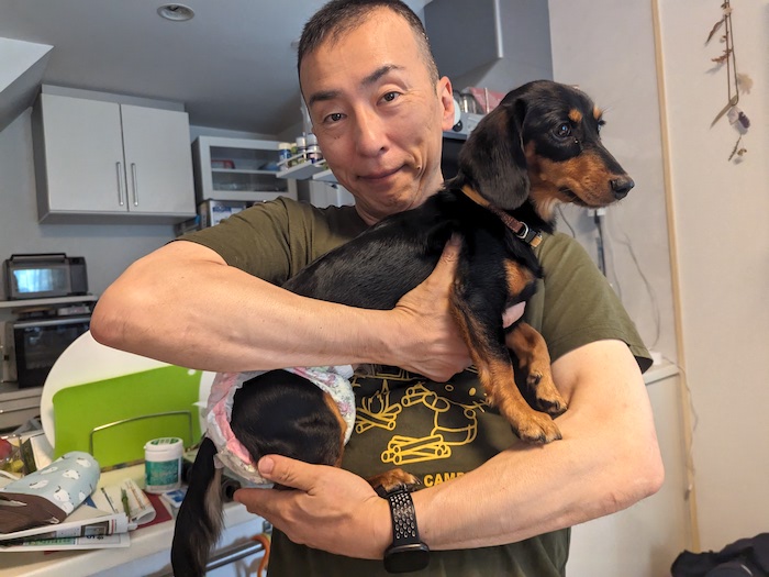 うちに帰って、麦茶にオムツを履かせてみました。車で移動する時なんかも、コレ履いていれば良いですね。割と素直に履いてくれたので、あとは乗り物酔いを克服できれば‥とお出かけしましたが、8km先の目的地に着くまでに吐きました。麦茶と遠方にお出かけするのはまだ先のコトになりそうです。