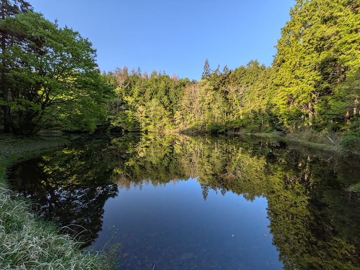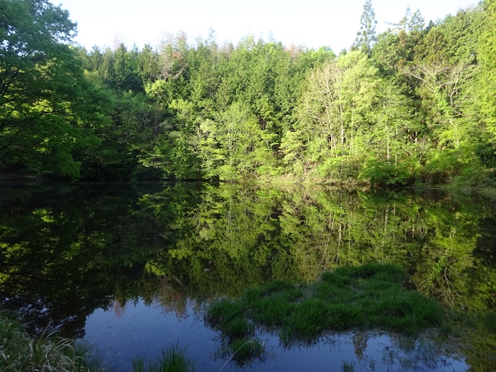 この森にはいくつか灌漑用のため池があるのだけれど、朝は水鏡に朝日を受ける木々が映り込んで、日常とは全く違う世界をつくっています。