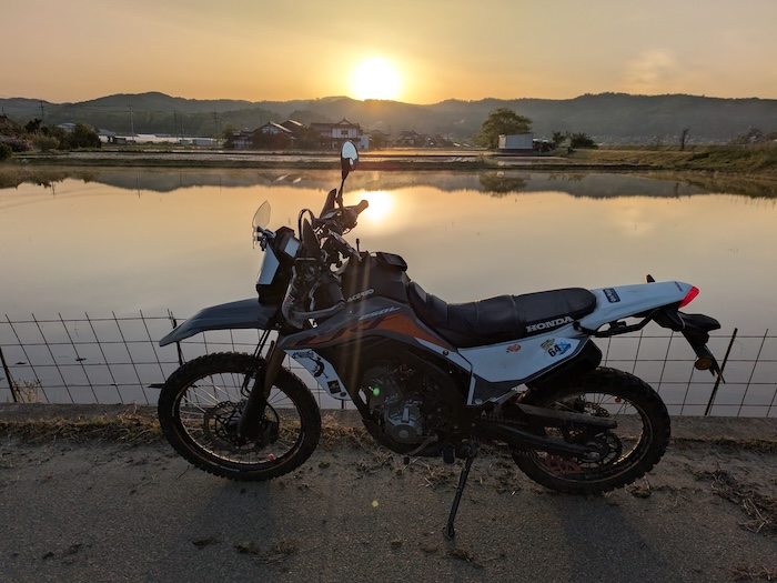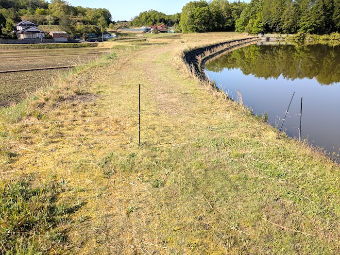 帰る途中、ため池の土手を気持ちよく走っていたところ、細いポールに気がついて、急制動!止まったのは猪避けの電気柵の手前1mくらいのところ。杭がなければ気が付かなかった。よく見ると電気の通った線が2本横向きに張ってあります。
