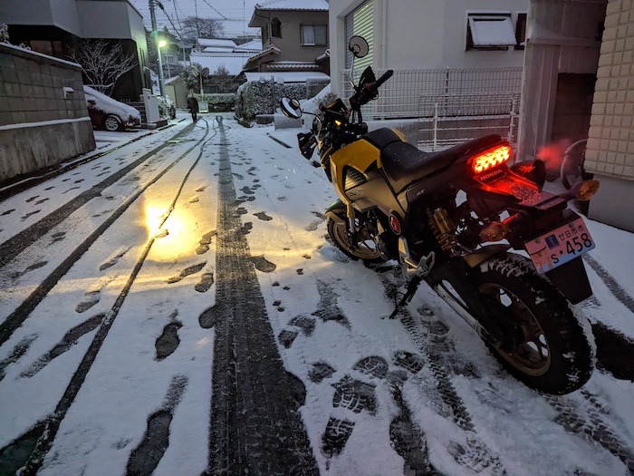 職場到着。雪道ツーキング、楽しかったかと言われるとやや複雑‥。ノーマルタイヤの自動車がアイスバーンの上を相当数走っていて、走るのも停まるのもヨレヨレと斜めになったりしてこちらが相当怖い思いをしました。雪がある程度積もっている方がグリップが良いので路肩の方が道路の真ん中よりもかなり走りやすい、けれど道が狭い。山の雪道走行は自分で好き勝手走れるのに、街なかは制約が多すぎて楽しいというよりはハラハラすることばかり。