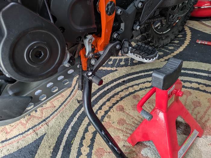サイドスタンドを出しているとオイルフィルタなどの抜き出しに干渉しそう、でも若干車体を左に傾けたい‥ということで前回のオイル交換ではステップホルダの下にウマをかけたはずなのに、こんかいはどう考えても車体が立ちすぎるどころかかけられない。はて?