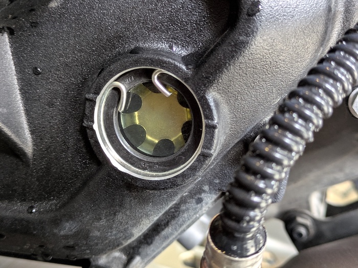 2つのドレンボルトを抜いてオイルを排出したあと、ドレンボルトを車体に戻してからオイルフィルターカバーを外してフィルタを交換して組み付け、がマニュアルの手順。