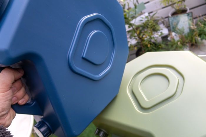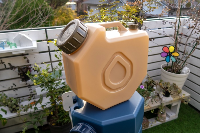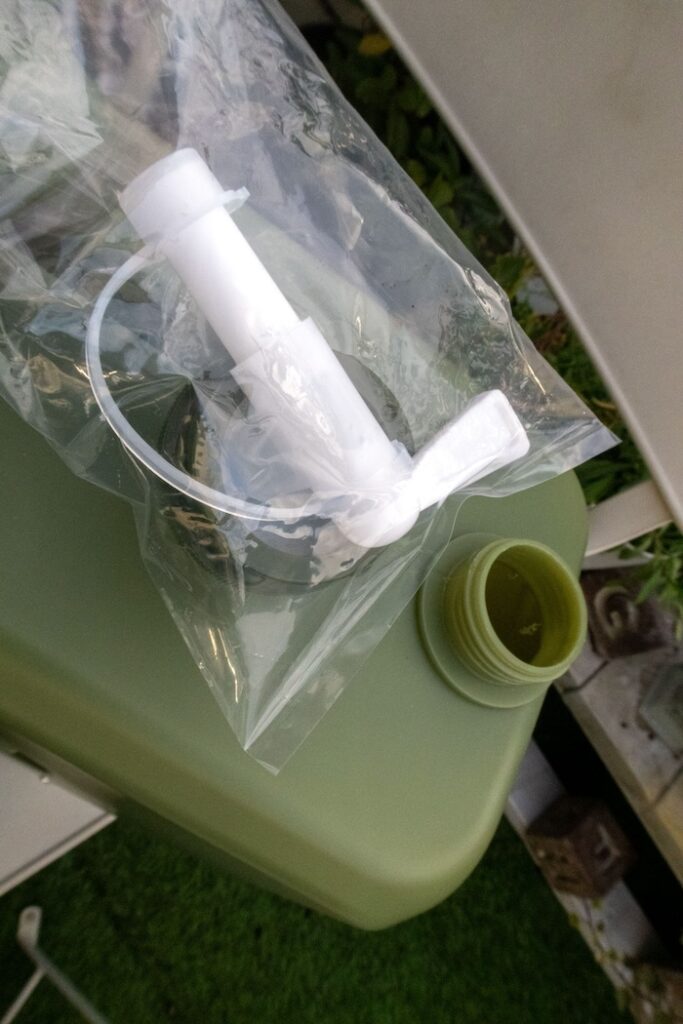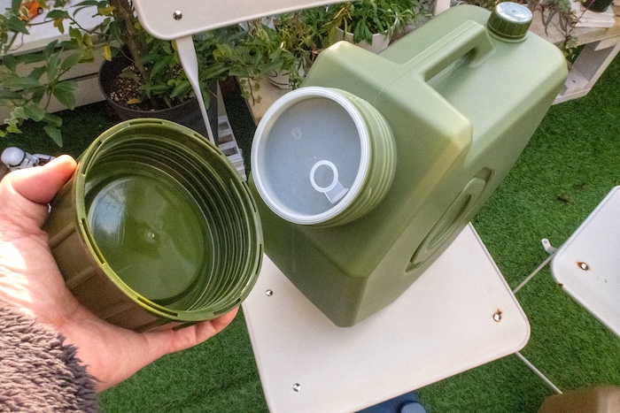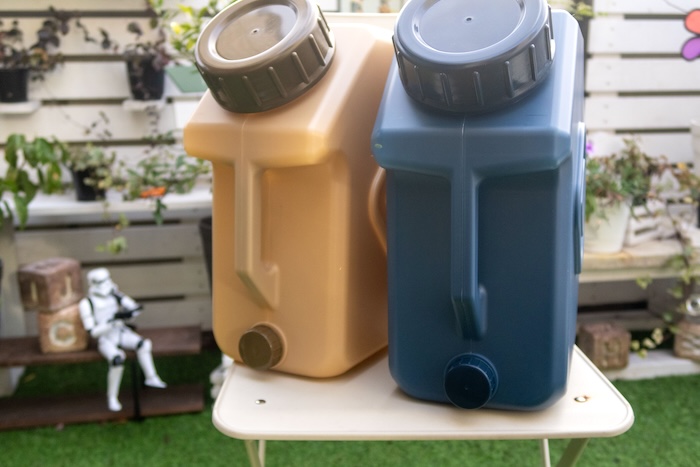 小さい方の口は付属のコックと交換できるので、ウォータージャグとして使えます。このウォータータンク、車に常備しておけば名水を汲んで帰るにも良いかな、と。