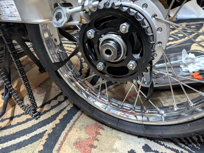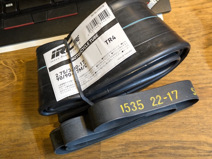 タイヤチューブは2.50/2.75でも2.75/3.00でも使えるっぽいので太いのにしましたが、純正は2.50/2.75でした。2.50/2.75だとフロントと兼用できるので、ツーリング時の修理用に持っておくなら2.50/2.75一択です。