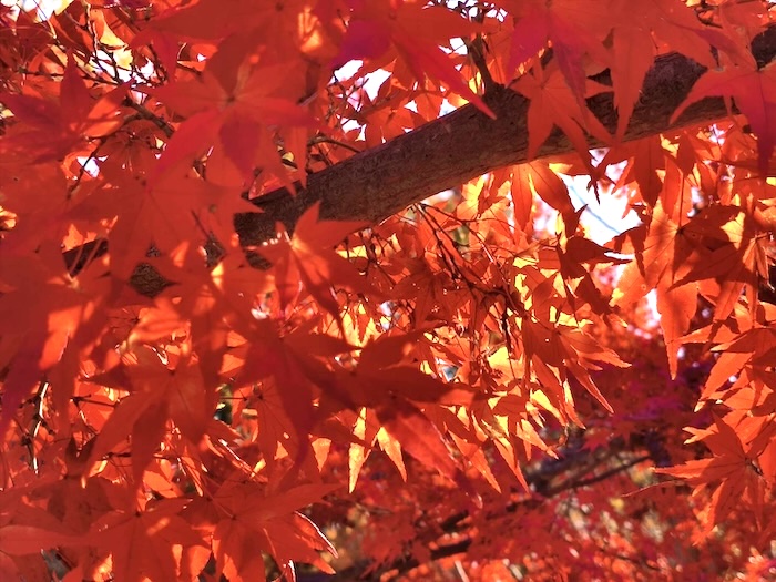沢沿いは紅葉も早く、色づきも綺麗に思います。大聖院ルートは沢沿いの道なので、いろいろな木々がさまざまに色づいていて、とても気持ちの良いトレイルウォークでした。
