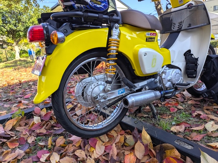 なぜここなのか、というとリアタイヤを抜くにはセンタースタンドの下に下駄を履かせる必要があるのですが、そのかわりにこの段差が使えないかと思ったから。