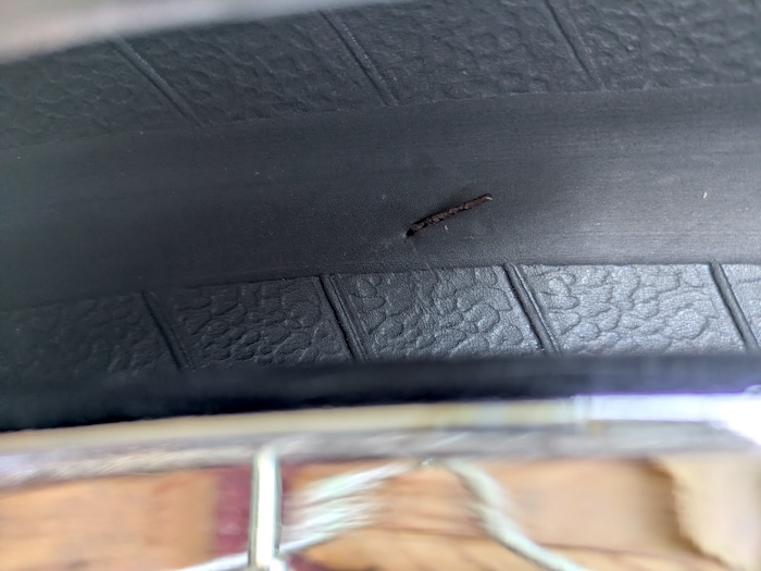 さて、パンクしたまましばらく走ってここまで来たので、穴はひとつふたつどころかぱっと見でも10箇所以上あります。最悪車載しているアロンアルファで補修できなくはないと思いますが、