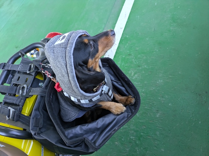 例によって家族は電車で宮島口へ、僕と麦茶はバイクで渡島する方法で。