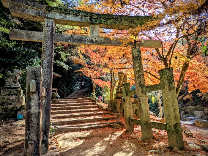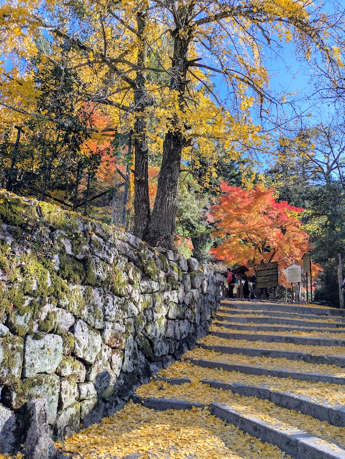 秋、そして宮島、といったらモミジを楽しむことしか頭にありませんでしたが、モミジではない木々も弥山へ向かう登山道ではとても綺麗に色づいていました。葉に透ける光で辺りがオレンジ色に見えるほどです。