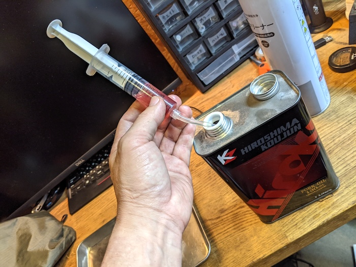 そこで10ccほどヤマハG15を抜いて、広島高潤の130cStという高粘度フォークオイルを10cc補充しました。オイルをシリンジで引き抜くときに粘度の違いを強烈に感じます。指定オイルのホンダG10の粘度が35.2cSt、ヤマハG15は47.7cSt、カヤバのG30Sが116.1cStです。130cStというのは結構な高粘度。