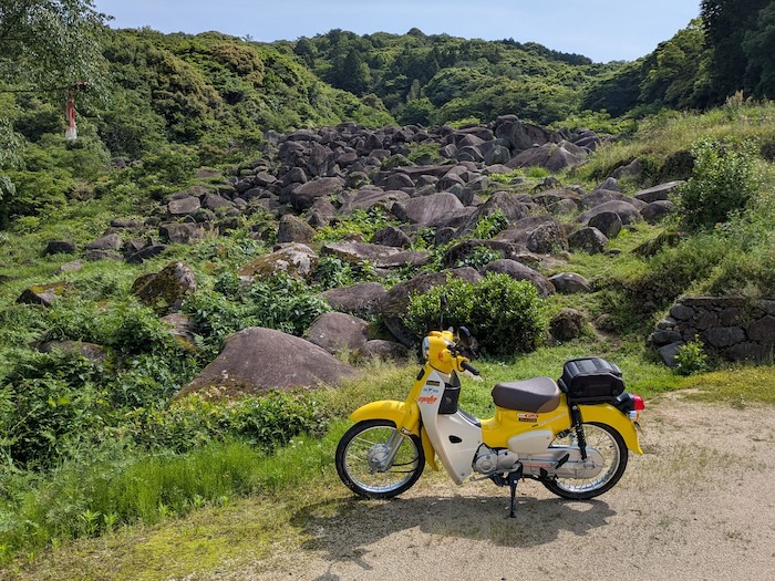 ジオキャッシングで訪れると、自分で地図をたどるというよりもナビ任せで到着させられる感じで、自分が地図上のどこに来ているのかわからなくなることがあります。吉部の大岩も万倉の大岩も5年前にCB250Rで訪れていました。