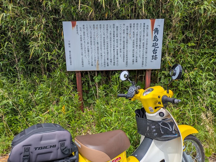 こちらに掲載された資料によると、第2砲座は角島大橋の架橋に伴う島内横断道路の整備の際にに潰されていて、第3、第4砲座も藪の中で、第1砲座跡を示す看板の裏の藪を刈り込んだら直径11mの砲座が見えてくるようです。