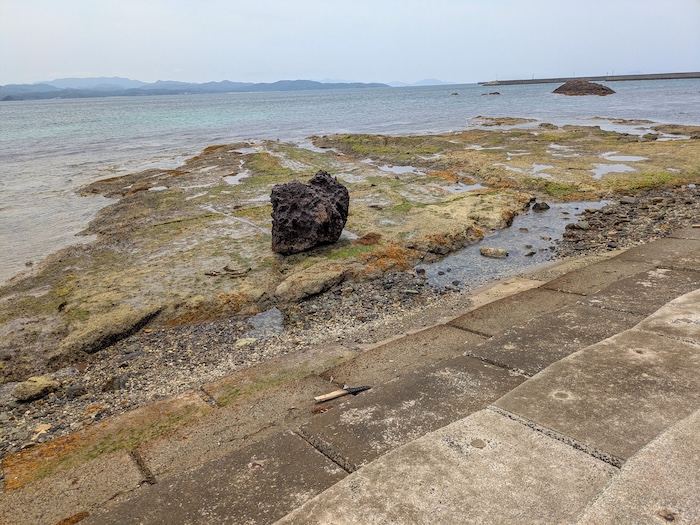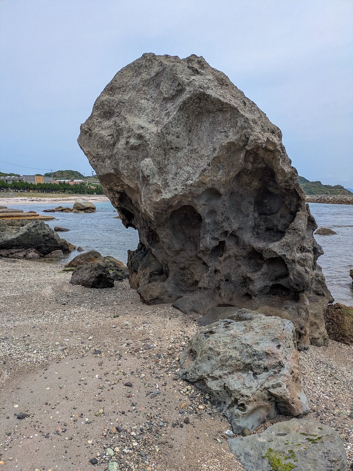 角島を本土と陸続きにしようと本土から鬼が石を投げたけれど、それが叶わず、最後にやけになって岩を握りつぶして投げた、とされる大岩。手の大きさからすると、ガンダムですかね。