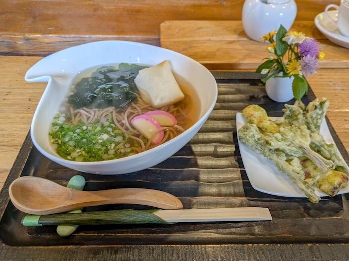 やっと昼ごはん、というか朝ごはん。きょうは「さくや」という店名を冠した蕎麦のセットを頼んでみました。餅の載ったいわゆる力蕎麦に季節の野草とちくわの天ぷら。