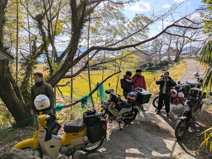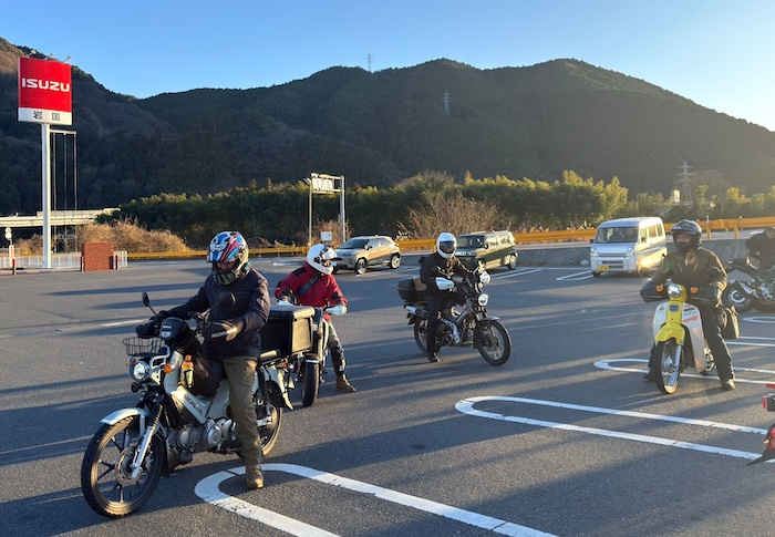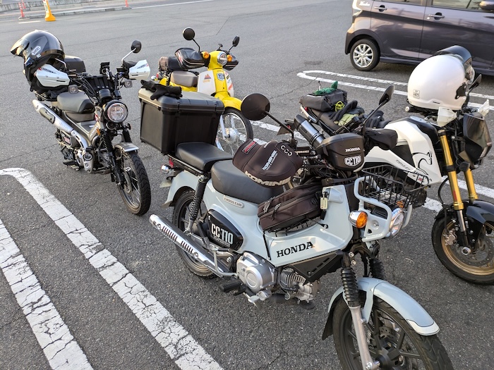僕のカブに彦衛門さん、彦衛門さんのハンターカブに僕。