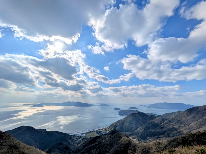 岩国市由宇町の大将軍山の山頂にある霧峯神社は以前は木々に覆われて寂しい展望の風景だった覚えがあるのですが、周囲の木立をバッサリ切ってしまったおかげで境内の裏側から到着すると「うお」と思わず声が漏れるような大パノラマの海景が広がっていました。