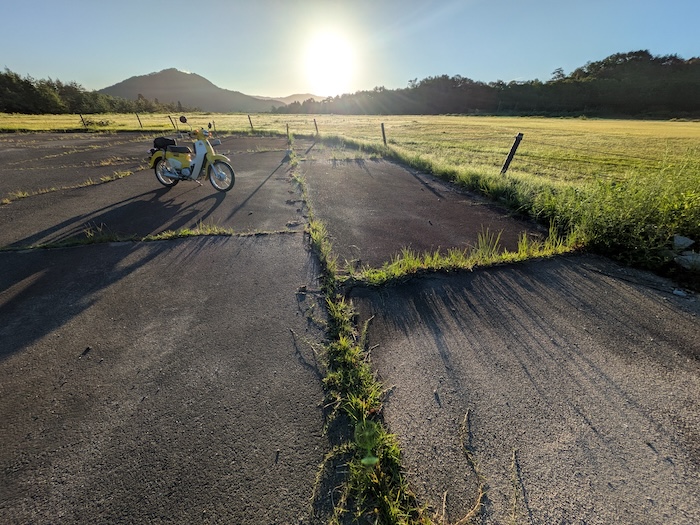 フラっと彷徨い込んだ道の奥にとても綺麗に整備されて開けた草原に出ました。あとで地図をみて気がついたのですが、いつか訪れようとマークしてあった加計スカイスポーツクラブというウルトラライトプレーンを飛ばしている団体の飛行場でした。