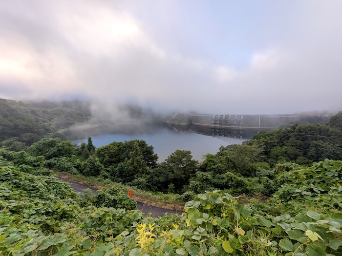ガスが山を隠してくれるので、見慣れた景色も知らない風景になっています。温井ダム。