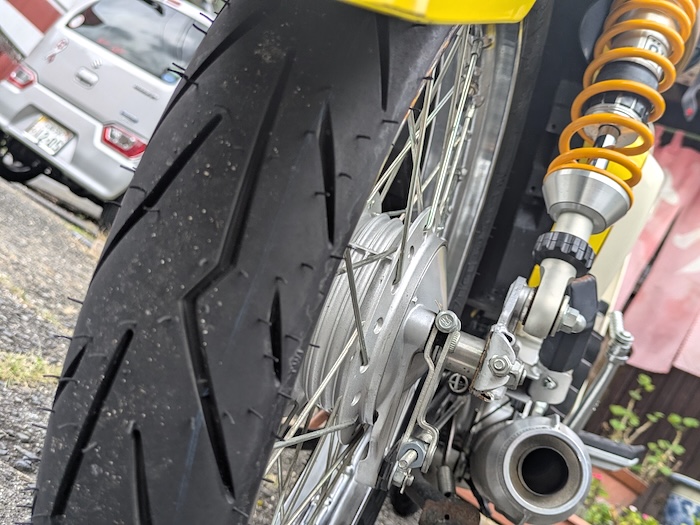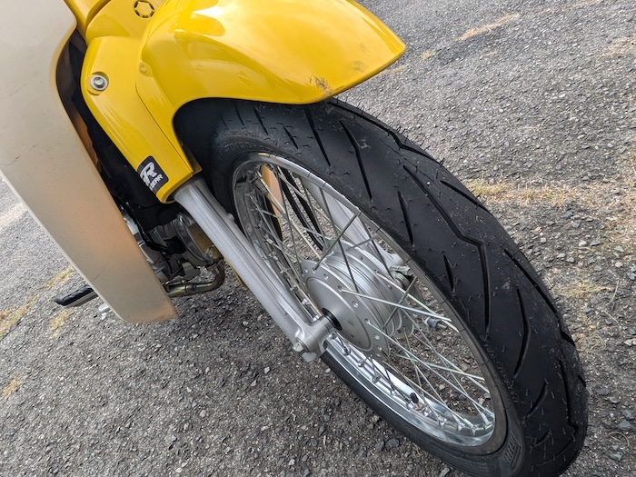 カブっぽさが弱くなって普通サイズのオートバイに乗っているような感覚になるので、普通のオートバイにしてはエンジンが非力であることが気になってきます。逆に言うとこのタイヤだったら何をやってもタイヤが受け止めてくれる、という感じです。
